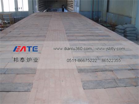 臺車面為承重層采用重磚,以保證抗壓強度。隔熱層分兩層,一層為硅藻土磚,二層為輕質粘土磚,以保證隔熱效果。臺車四周易碰撞部位和承重部位用重質磚砌筑,增強爐襯結構強度。