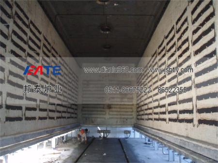 爐襯采用全纖維大板塊結構吊掛在鋼骨架上,承重部分采用重質耐火磚砌筑,以增強爐襯的結構強度。臺車保溫層采用硅酸鋁耐火纖維、硅藻土保溫磚復合節(jié)能結構,以提高爐體的保溫節(jié)能性能。